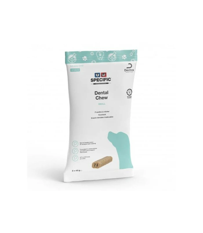 Les produits dentaires à mâcher SPECIFIC ont une texture flexible et une texture ouverte qui permet aux dents de pénétrer profondément dans la friandise. La dent grattée est ainsi nettoyée. Le long temps de mastication garantit l’efficacité du nettoyage. Ils contiennent également des ingrédients pour aider à réduire la plaque dentaire et le tartre et favoriser une haleine fraîche :