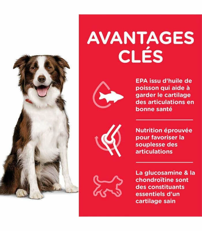 Cet aliment favorise la santé des articulations et améliore la mobilité des chiens de grande taille grâce à une nutrition de pointe. Sa formule parfaitement équilibrée contient de l’EPA, issu d’huile de poisson, qui favorise la souplesse des articulations et aide à garder le cartilage en bonne santé. Cet aliment, recommandé par les vétérinaires, apporte de la glucosamine et de la chondroïtine, constituants essentiels d’un cartilage sain.