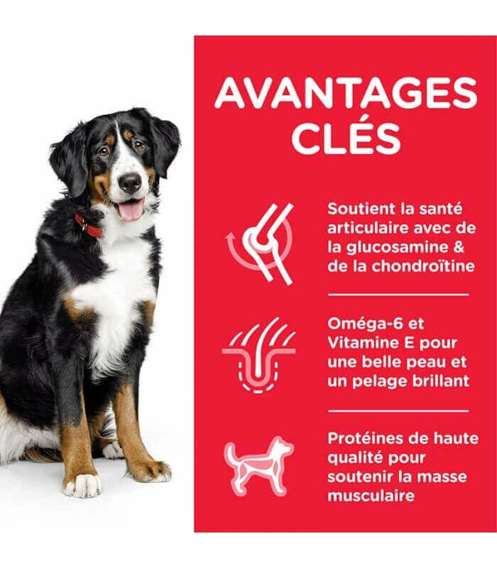 Cet aliment est élaboré à partir d’ingrédients de haute qualité faciles à digérer. Il aide à soutenir l’immunité, la santé articulaire grâce à la glucosamine et la chondroïtine et la masse musculaire de votre chien adulte grâce à des protéines de haute qualité. Cet aliment, recommandé par les vétérinaires, offre le juste équilibre en nutriments pour aider votre chien à mener une vie longue, heureuse et en pleine santé à vos côtés. Il procure également des oméga-6 et de la vitamine E pour une belle peau et un pelage brillant.