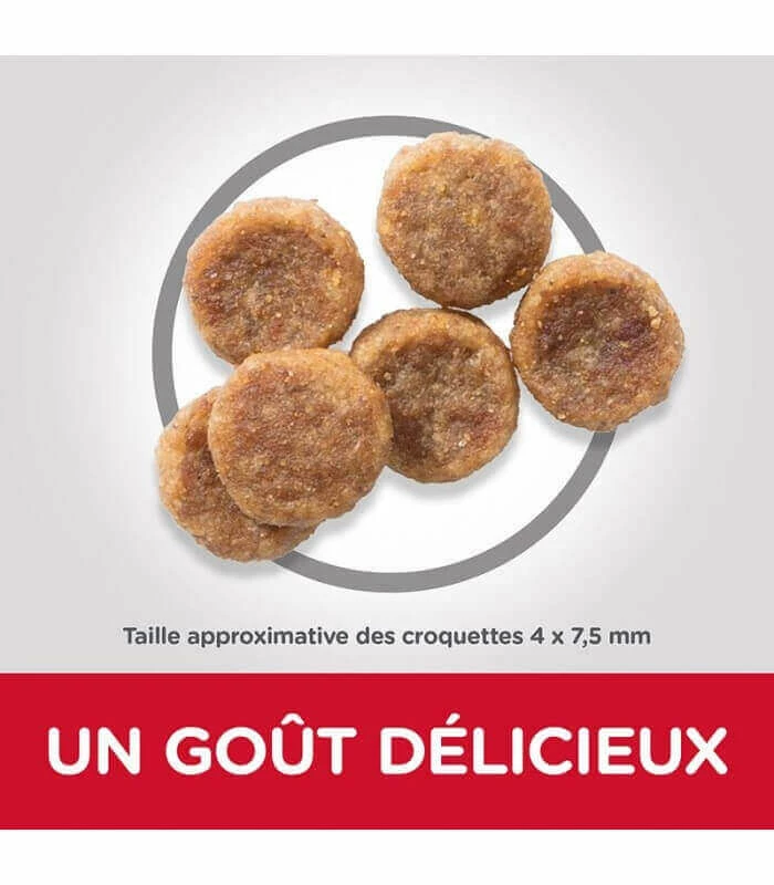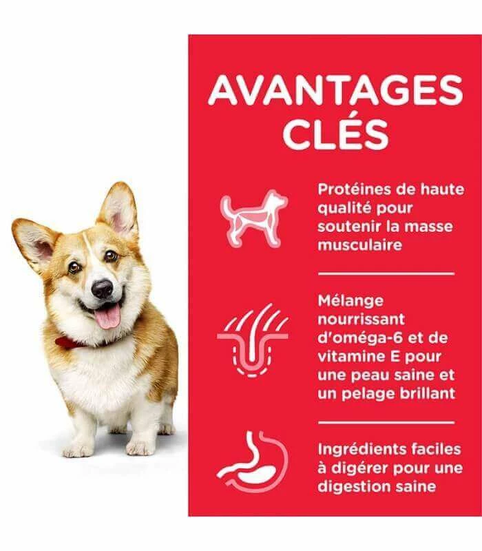 Recommandé par les vétérinaires, cet aliment apporte une nutrition adaptée aux besoins de votre compagnon. Ses ingrédients faciles à digérer respectent l’estomac de votre petit chien et favorise une digestion saine. Ses protéines de haute qualité maintiennent sa masse musculaire et les oméga-6 et la vitamine E participent à la santé de la peau et à la brillance du pelage. Grâce au mélange exclusif d’antioxydants, il soutient la vitalité de votre chien et renforce son système immunitaire. Enfin, sa teneur équilibrée en minéraux favorise la bonne santé de ses reins et de son cœur.