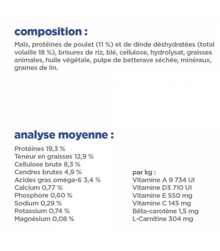Demandez conseil à votre vétérinaire pour connaître les quantités journalières selon le poids de l’animal. De l’eau fraîche et propre doit être disponible à tout moment de la journée.