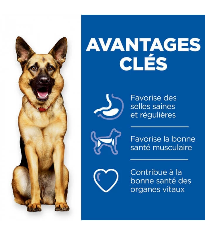 Cet aliment est élaboré avec le mélange de fibres ActivBiome+, cliniquement prouvé, pour favoriser des selles saines et la régularité du transit intestinal en nourrissant uniquement les bonnes bactéries qui vivent dans l’intestin. Il est fabriqué avec des ingrédients de haute qualité répondant aux critères Hill’s les plus stricts en matière de pureté et de contenu nutritionnel. Cet aliment procure des protéines de haute qualité pour favoriser la santé musculaire et aide à soutenir la bonne santé des organes vitaux avec des teneurs contrôlées en minéraux. Les acides gras Oméga-6 et Oméga-3 aide à garder la peau saine et le pelage luxuriant.
