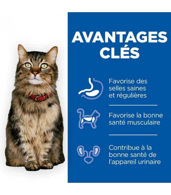 Cet aliment est élaboré avec le mélange de fibres ActivBiome+, cliniquement prouvé, pour favoriser des selles saines et la régularité du transit intestinal en nourrissant uniquement les bonnes bactéries qui vivent dans l’intestin. Il est fabriqué avec du saumon et des ingrédients de haute qualité répondant aux critères Hill’s les plus stricts en matière de pureté et de contenu nutritionnel. Cet aliment favorise la santé musculaire et du système urinaire. Les acides gras Oméga-6 et Oméga-3 aident à maintenir une peau saine et un pelage luxuriant et des antioxydants cliniquement prouvés soutiennent le système immunitaire grâce à un mélange exclusif de vitamines C et E.