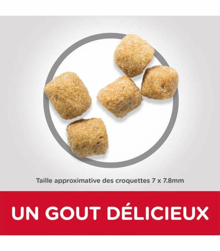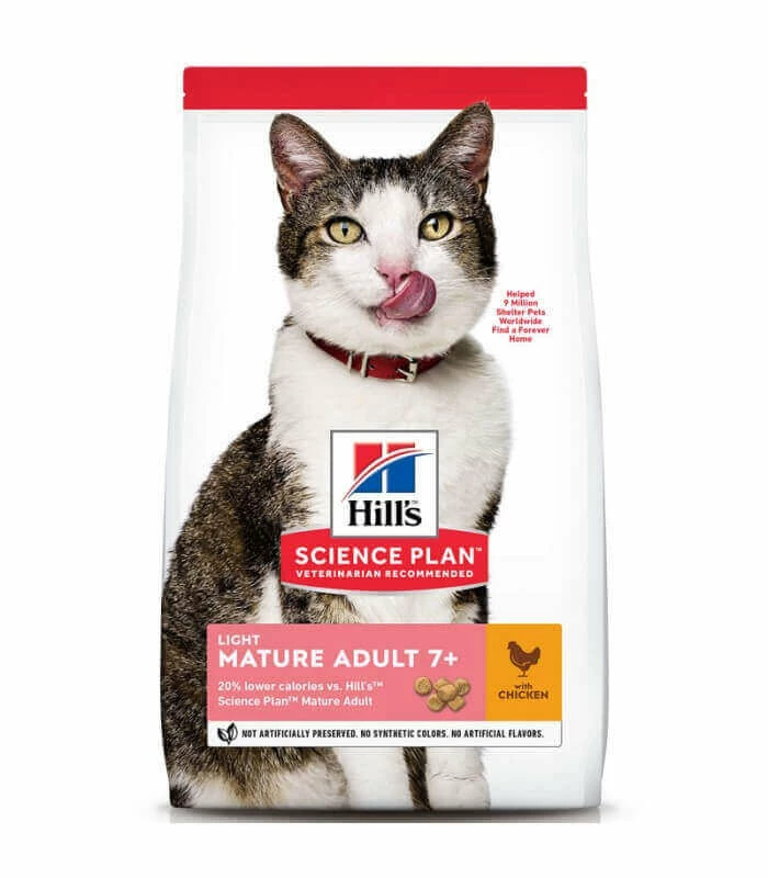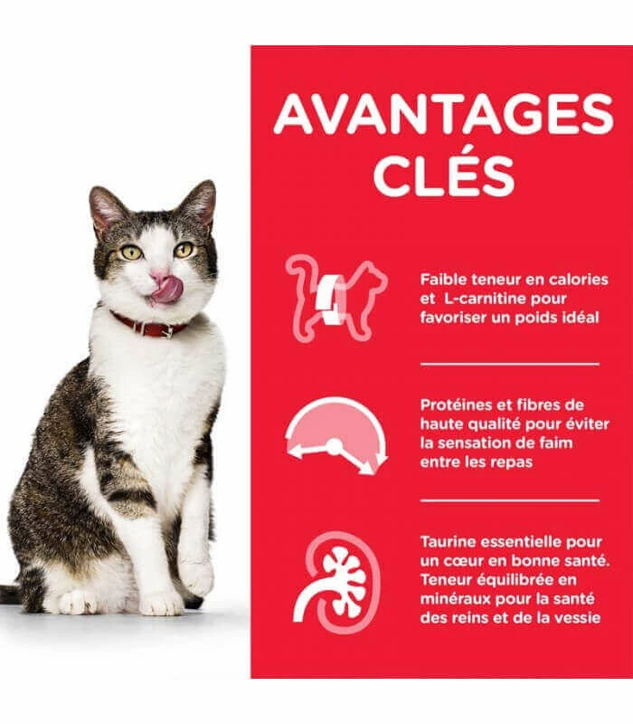 Cet aliment répond aux besoins des chats âgés ayant un faible apport calorique (chats moins actifs, castrés ou prédisposés à l’excès pondéral). Elaboré à partir d’ingrédients de haute qualité, cet aliment apporte à votre chat -18% de calories comparé aux croquettes Hill’s Science Plan Mature Adult. Il procure de la L-Carnitine pour aider à maintenir un poids idéal et sa teneur en fibres naturelles et en protéines de haute qualité aide votre compagnon à contrôler sa sensation de faim entre les repas. Cet aliment favorise un pelage brillant et une peau en bonne santé grâce à la vitamine E et aux acides gras oméga-6.