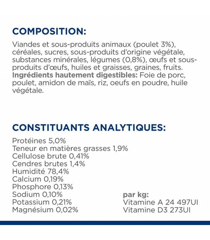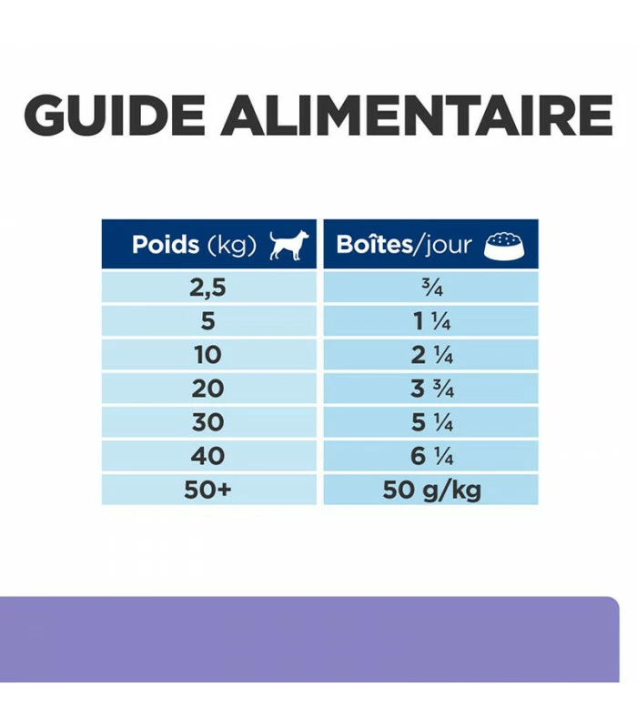 Aliment thérapeutique, il doit être prescrit par votre vétérinaire selon l’état de santé de votre animal. Les rations journalières conseillées doivent être adaptées aux conditions climatiques, à l’activité de l’animal et à sa condition physique selon les conseils de votre vétérinaire. De l’eau fraîche et propre doit être disponible à tout moment de la journée.