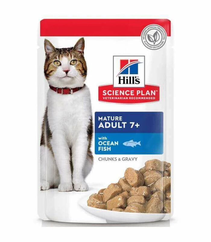 Cet aliment, présenté sous forme de bouchées en sauces, répond aux besoins des chats âgés en leur apportant des teneurs adaptées en vitamines, protéines, matières grasses et minéraux, nécessaires à la bonne santé de l’animal. Il est élaboré à partir de protéines de qualité supérieure pour conserver la masse musculaire de votre compagnon, soutient la santé cardiaque et aide à garder une peau saine et un pelage brillant. Les antioxydants et les vitamines C+E contribuent au ralentissement du vieillissement cellulaire, à la santé des reins et au maintien du système immunitaire de votre chat. Cet aliment complet et hautement digestible contient un juste équilibre de tous les éléments nutritifs dont votre chat mature a besoin. Saveur poulet et poisson. Peut être donné en complément des croquettes Hill’s Science Plan Mature Adult
