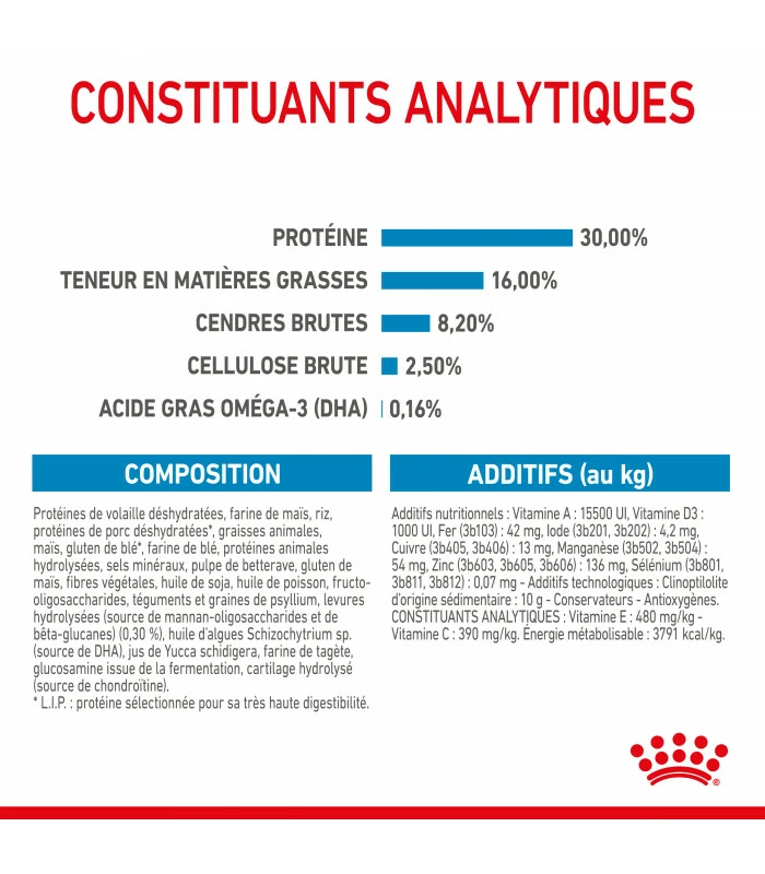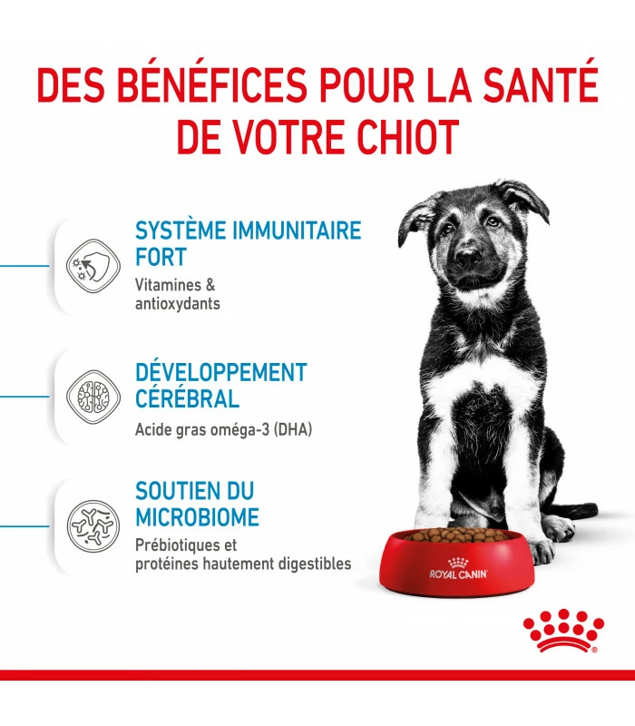 Cet aliment contient un supplément en acides gras essentiels et une combinaison équilibrée en protéines et en minéraux, destinés à préserver les os et les articulations pendant la croissance. Il garantit une appétence maximale grùce à ses ingrédients de qualité et des protéines trÚs digestibles (pulpe de betterave et huile de poisson) qui favorisent une bonne tolérance digestive. Sa formule exclusive renforce les défenses naturelles et la couleur du poil du chiot.