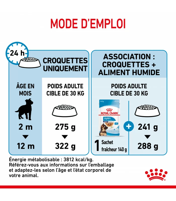 Demandez conseil Ă votre vĂ©tĂ©rinaire pour connaĂźtre les quantitĂ©s journaliĂšres selon le poids de l’animal. De lâeau fraĂźche et propre doit ĂȘtre disponible Ă tout moment de la journĂ©e.