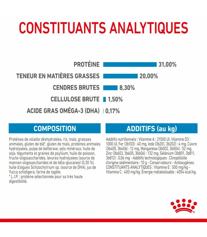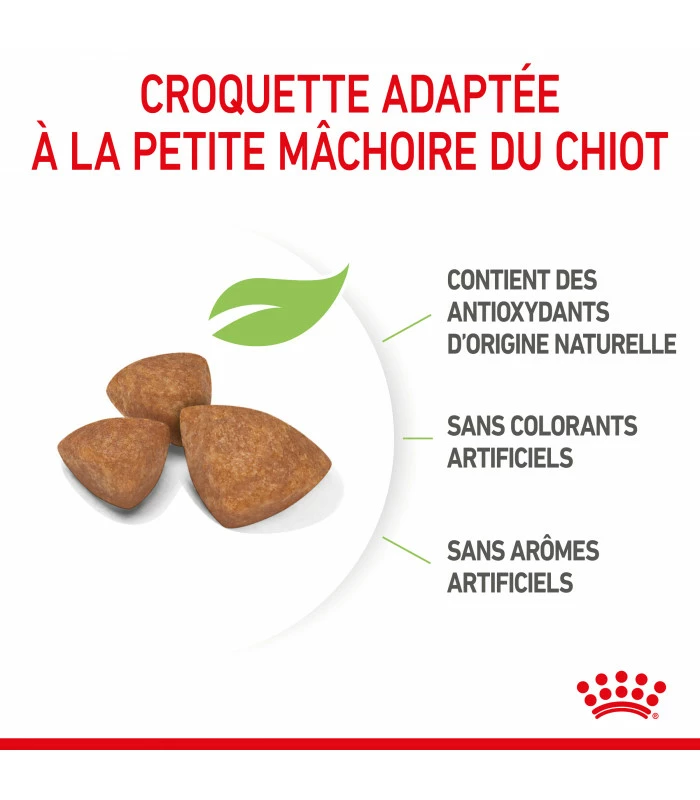 Cet aliment contribue à limiter la formation de tartre, il est hautement digestible. Sa formule contient un complexe d’antioxydants aidant à renforcer les défenses naturelles du chiot pendant la croissance. La barrière cutanée est renforcée grâce à un complexe breveté de vitamines B.