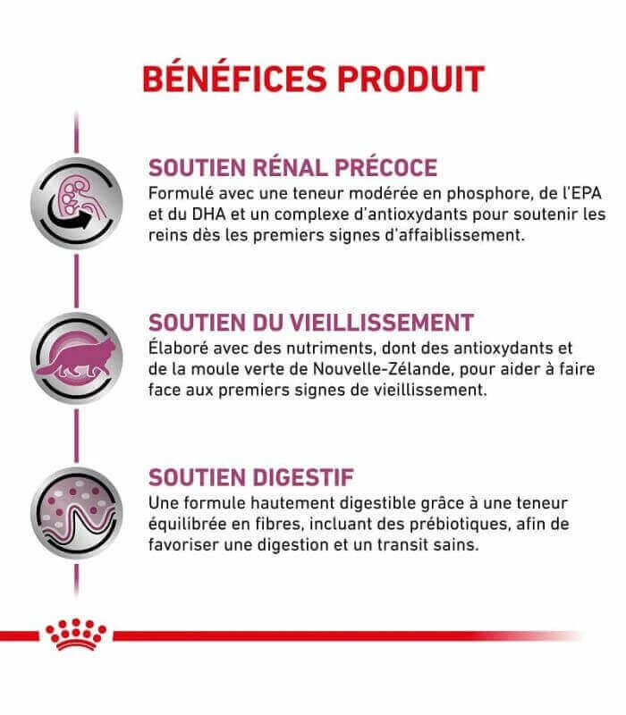 Cet aliment est indiqué pour les stades précoces de l’insuffisance rénale chronique. Sa teneur réduite en phosphore et ses protéines de haute qualité aident à soutenir fonction rénale.