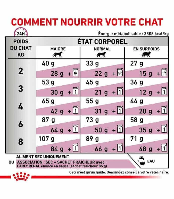 Aliment thérapeutique qui doit être prescrit par votre vétérinaire selon l’état de santé de votre animal. Les rations journalières conseillées doivent être adaptées aux conditions climatiques, à l’activité de l’animal et à sa condition physique selon les conseils de votre vétérinaire. De l’eau fraîche et propre doit être disponible à tout moment de la journée.